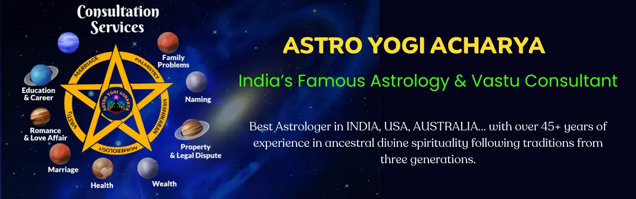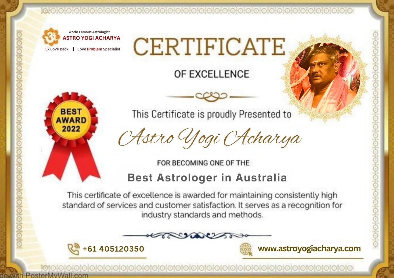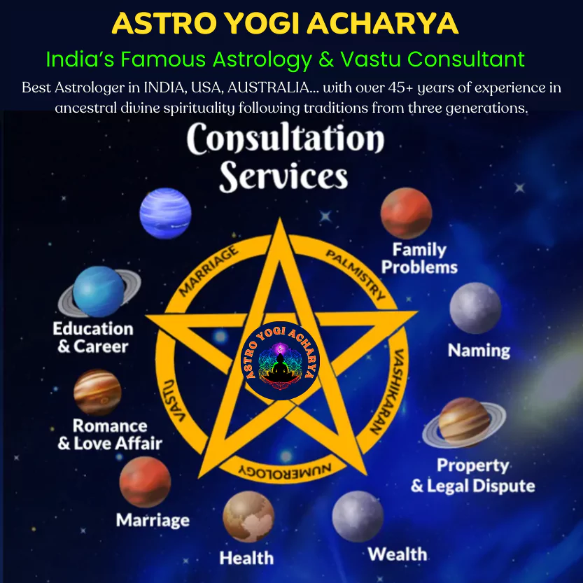 ASTRO YOGI ACHARYA Being India’s Famous Astrology consultant for 35+ years with ancestral divine spirituality in VEDIC ASTROLOGY from three generations and now in AUSTRALIA, Our Astrologer SRI YOGI ACHARYA JI from INDIA is known for making 99% accurate predictions and delivering positive results on daily life hurdles. predicts your future by seeing your palm, face, or photo and Kundali.Get expert solutions & remedies for life issues in stipulated time like Relationships and Love, Sexuality, Money and Wealth, Career, Health and Nutrition, Children and Family, Past Life, Karmas, Vasthu Dosha and Graha Dosha, Business, Court Case, Film Industry, politics and Abroad. Any” problem there will be a solution